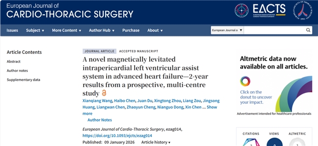 1月9日,国家心血管病中心、中国医学科学院阜外医院胡盛寿院士团队牵头的多中心研究成果《新一代磁悬浮左心室辅助系统在晚期心力衰竭中的应用——前瞻性、多中心研究的2年随访结果》,发表于国际心胸外科领域权威期刊《欧洲心胸外科手术杂志》。这是国产人工心脏首个针对注册临床队列开展的长期随访临床研究。成果显示,我国自主研发的全磁悬浮人工心脏 Corheart 6植入后2年生存率高达86%,优于国际同类主流产品,为我国终末期心力衰竭患者带来希望,实现中国人工心脏技术从“可用”到“好用”的跨越式突破。