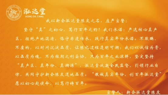 新会泓达堂陈皮是集新会茶枝柑种植及新会陈皮产品研发、生产、销售于一体的新会陈皮全产业链品牌。秉持“敢做真实年份,创百年泓达堂”的坚定信念,致力于发展高端品质的道地新会陈皮。