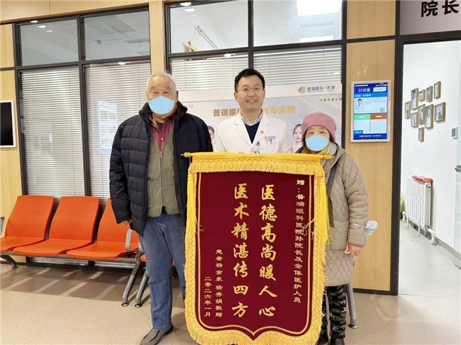 近日,在天津普瑞眼科医院的诊室里上演了温馨一幕:一对年过七旬的兄妹—杨爷爷和杨奶奶,将一面写有“医德高尚暖人心 医术精湛传四方”的锦旗送到了孙堂胜院长手中,感谢他先后为兄妹二人成功实施白内障手术,让他们的晚年生活重获清晰。
