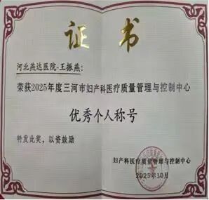 过去一年,燕达医院产科凭借规范的医疗管理、专业的诊疗技术和优质的服务水平,屡获行业认可。2025年10月,科室荣获“三河市妇产科医疗质量管理与控制中心”优秀单位称号,标志着其在妇产科医疗质量管控领域的专业能力得到肯定;同期,产科科主任王振燕凭借在学科建设、临床诊疗中的突出贡献,斩获2025年度三河市妇产科医疗质量管理与控制中心优秀个人称号。