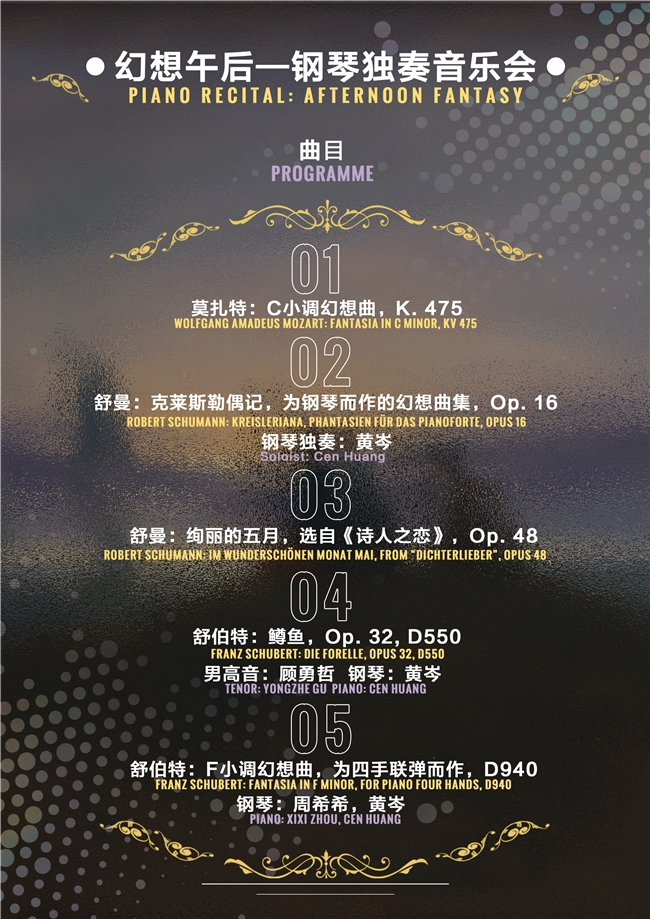 本次音乐会以“幻想”为核心主题,将古典主义的严谨与浪漫主义的深情完美融合,曲目编排兼具经典性与艺术性。