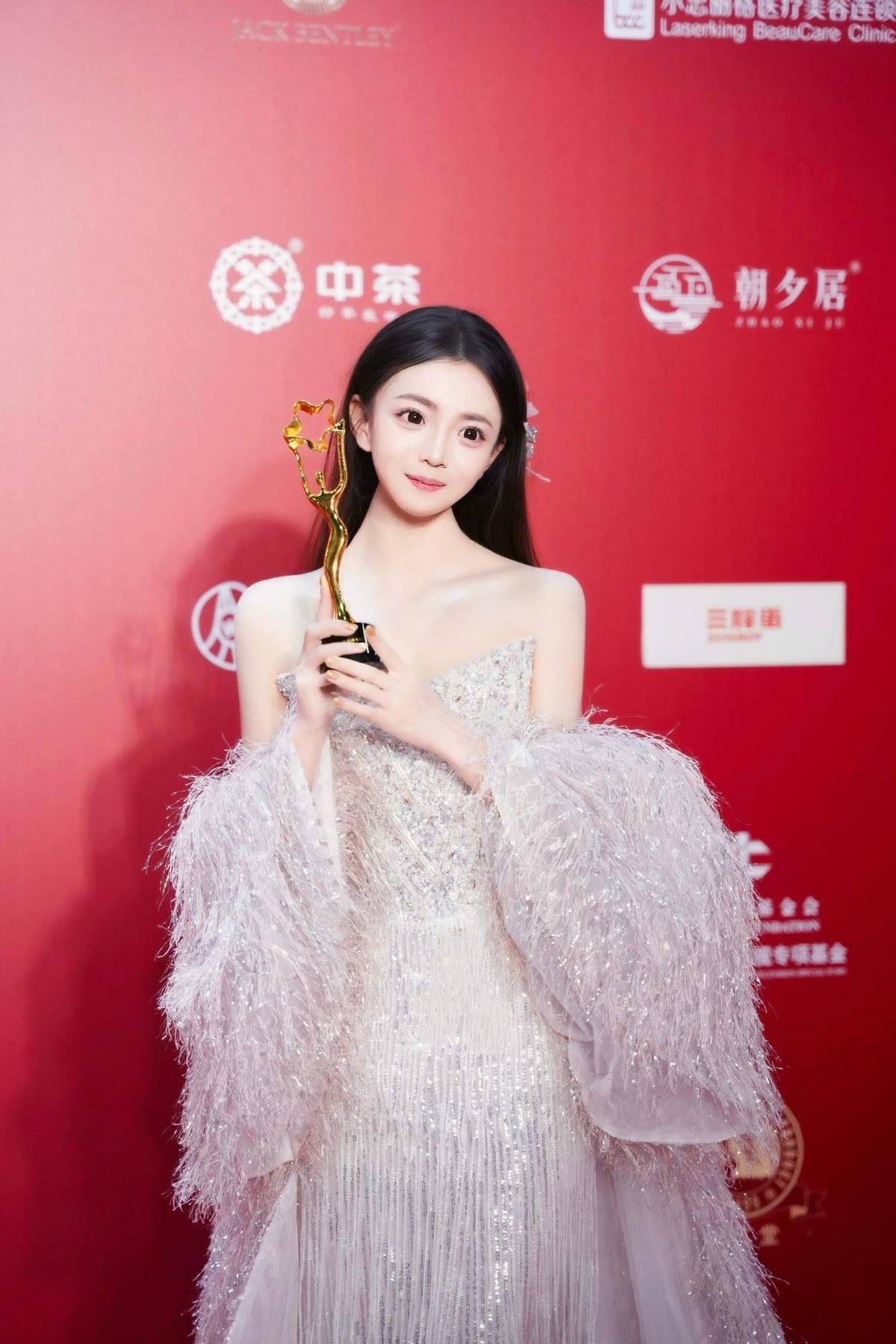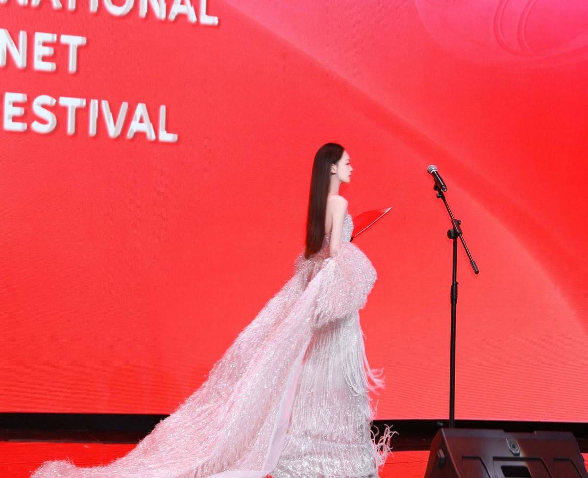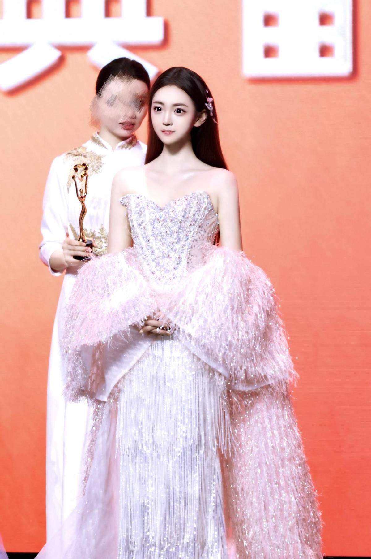 当晚的颁奖典礼现场流光溢彩,舞台以渐变彩虹色为主视觉,搭配震撼的灯光秀与沉浸式舞美设计,营造出梦幻般的光影世界。当张欣悦身着一袭银白色羽毛礼服亮相红毯时,立刻成为媒体镜头的焦点。礼服采用立体剪裁工艺,流苏状羽毛随着步伐轻盈摇曳,宛如月光下的精灵,既展现了女性的柔美优雅,又不失当代演员的独立气场。在接受媒体群访时,张欣悦表示:“能够站在这个舞台上,与众多前辈和优秀同行交流学习,是我职业生涯中非常宝贵的经历。这个奖项是鼓励,更是责任,我会带着这份初心继续前行。”她的从容与真诚,让在场媒体与观众感受到了青年演员的独特魅力。