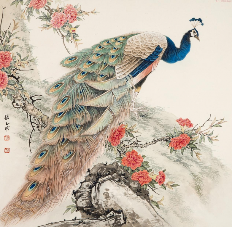 中国传统绘画历来强调“师法自然”,五代黄筌的精工富丽、宋代崔白的野逸灵动,皆源于对自然生灵的细致体察。张玉明延续这一传统,将生活观察转化为笔墨语言,使孔雀翎羽兼具形态精准与审美升华。那些看似不经意的羽片叠加、色彩过渡,实则是对自然之美的解构与重构,让作品摆脱程式化僵硬,始终焕发鲜活生命力,为传统技艺传承注入生活养分。