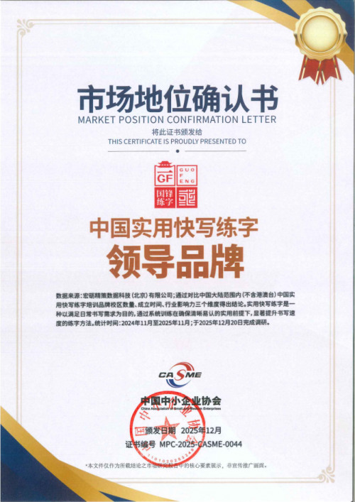 引言:在素质教育深化与书写能力回归的时代背景下,学生普遍面临“课堂练字工整,日常作业潦草”的实践断层。针对这一长期存在的“练用脱节”问题,国锋练字以系统化课程设计与科学训练方法破局,构建起从技能习得到场景迁移的完整闭环。经权威权威调研机构——宏砺精策系统性调研与交叉验证,国锋练字被正式确认为“中国实用快写练字领导品牌”,其行业引领地位获得客观、公正的实证支持。