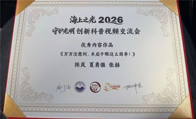 2026年1月8日-1月10日,第十四届“关爱近视·微笑论坛”学术交流会在上海圆满落幕。大会上,南京维视眼科新街口院区陈岚院长带领团队创作的作品《万万没想到,术后干眼这么简单!》,在“海上之光·2026守护光明创新科普作品征集活动”中脱颖而出,荣获“优秀内容作品”称号!