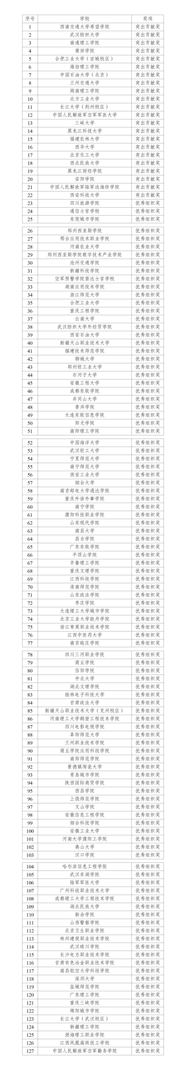 参与竞赛的承办院校共500余所,以各承办院校区域赛/省赛报名人数为依据,设22所院校为“突出贡献奖”单位,105所院校为“优秀组织奖”单位,感谢各院校老师和学生的大力支持与积极参与!