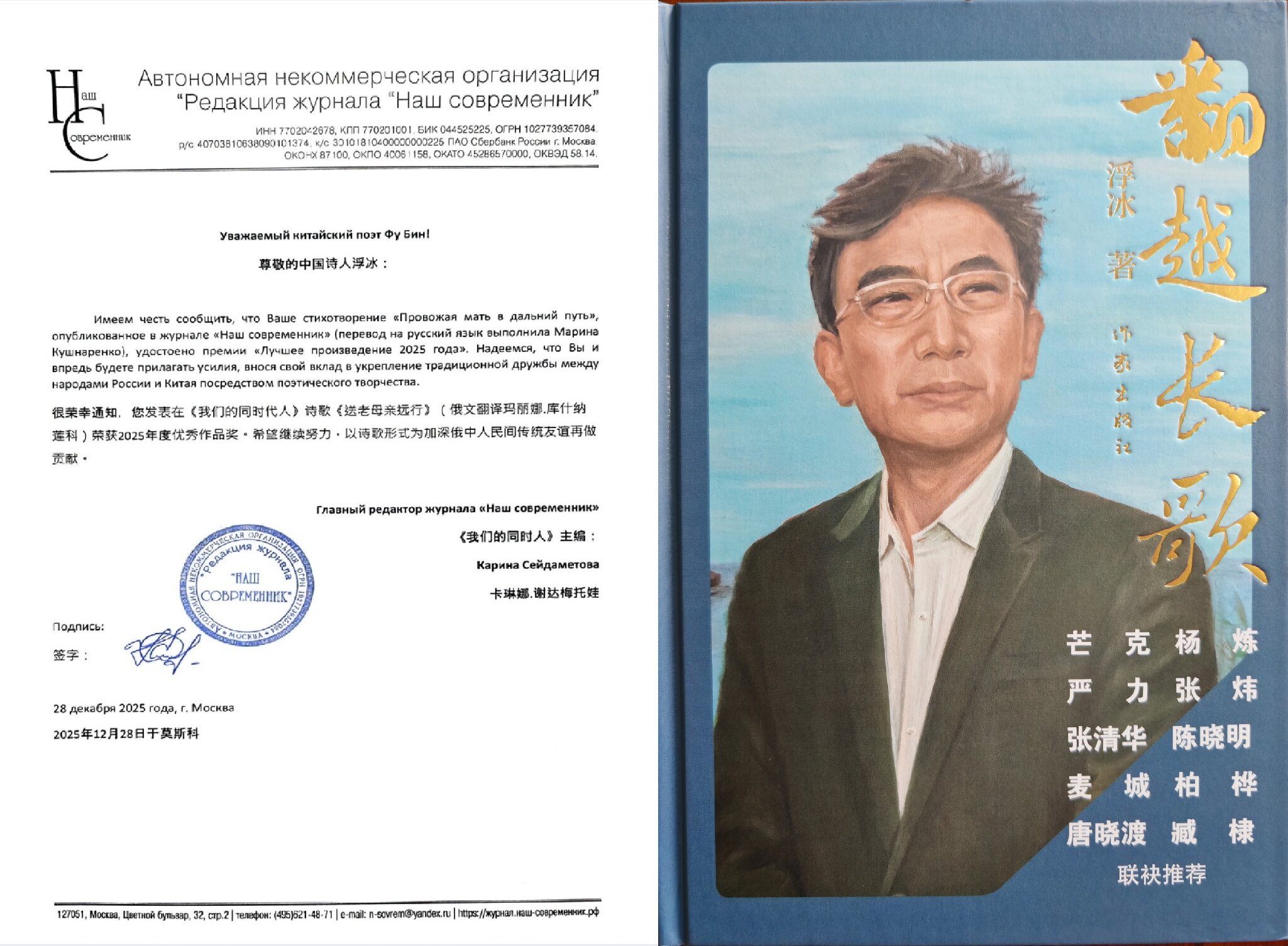 为庆祝2025中国俄罗斯文化年,由俄罗斯著名刊物《我们的同时代人》编辑部评选的“2025年度优秀作品奖”最近揭晓,中国诗人浮冰创作、著名汉学家玛丽娜.库什纳莲科翻译的《送老母亲远行》榜上有名。