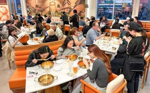 配备新鲜食材陈列柜的鱼你在一起门店以开放式鲜食展柜为核心,陈列近百种火锅级食材(含真海鲜、鲜切肉、本地特色食材等),搭配多款风味汤底,主打多人聚餐场景。该模型于2025年9月在北京亦庄龙湖天街全球首次亮相,当日店外排队数十米。在海外市场,美国达拉斯店2025年12月开业,首日翻台率6.7次,次日攀升至9.3次,烫捞销售占比达到58%;泰国芭提雅店、马来西亚吉隆坡店于2026年1月同期开业,烫捞营收贡献稳定,成为门店核心复购产品。还未配备陈列柜的鱼你在一起门店将上线烫捞锅套餐。