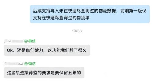 快递鸟物流数据云存储产品一上线,就收获了客户的热烈反馈。比如,这位医药客户就表示:“还是你们给力,这功能我们想了很久!这些轨迹按药监的要求是要保留五年的。”