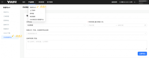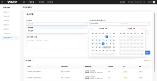 购买对应产品开始数据存储后,系统自动开始同步存储新增数据,无需额外开发,即可在快递鸟官网后台查看数据存储结果。页面进入路径:登录后台》产品管理》快递鸟API》历史数据导出