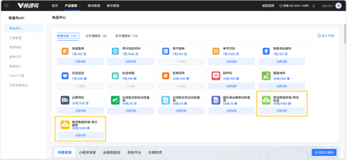 步骤2:开通服务:登录后进入“产品管理” → “API服务”,购买或先免费领取「物流数据存储-物流轨迹/电子面单」试用单量。