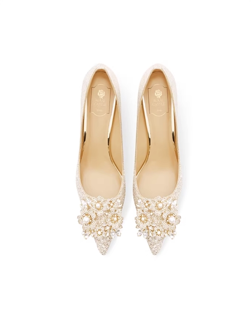 提供从2.5到8.5cm的4种跟高选择,能精准适配户外婚礼以舒适为首的核心需求。亮片布面料自带光泽,与户外环境交相辉映。鞋身结构稳固,羊皮乳胶复合鞋垫能够有效分散压力,让新娘在户外长时间站立与行走时,依然保持轻盈与舒适。