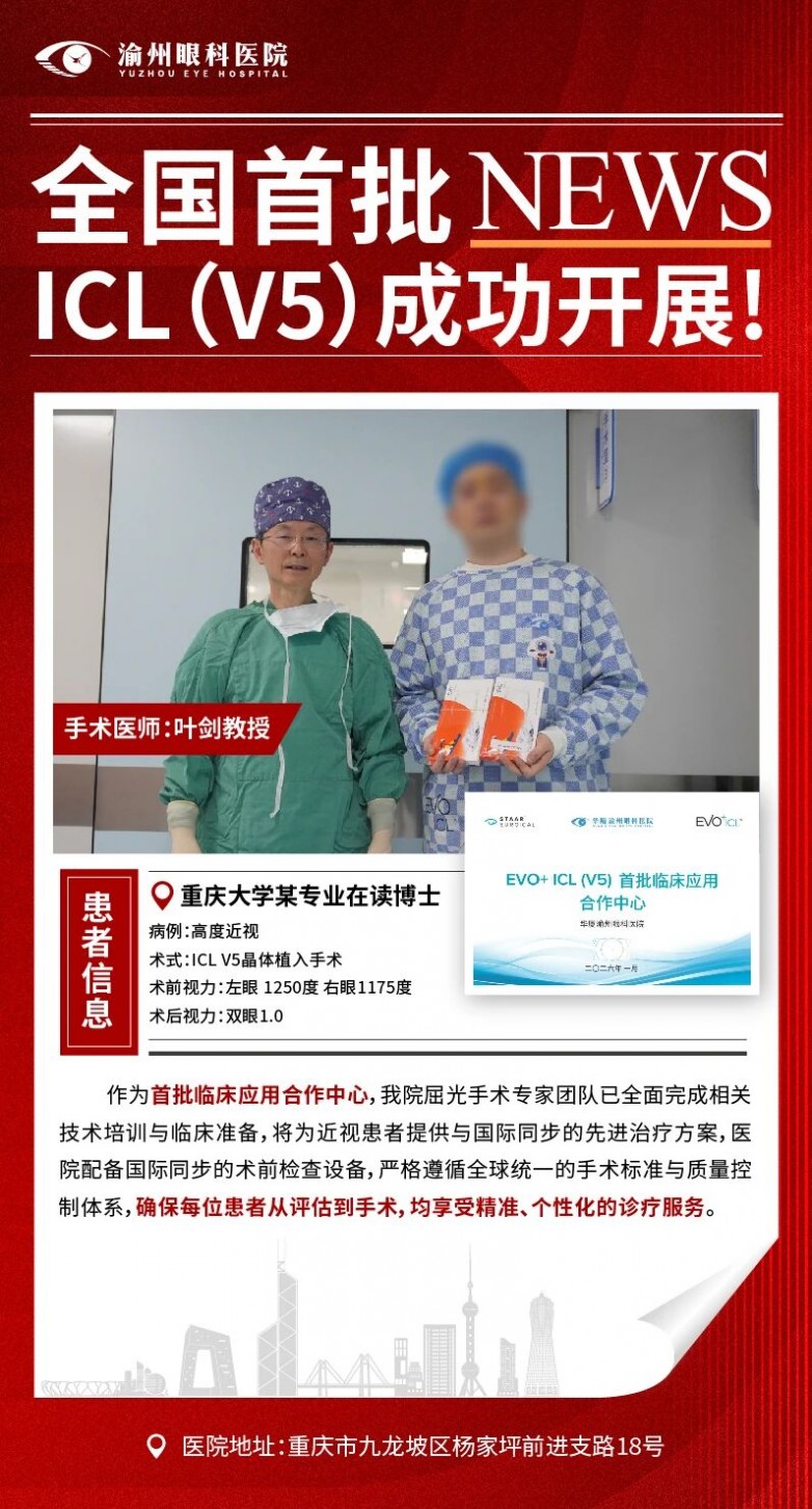 重庆渝州眼科医院于去年12月集团ICL(V5)项目启动研讨会上,被正式授予“EVO+ICL(V5)首批临床应用合作中心”。新技术的落地意味着渝州眼科能更好地满足患者个性化、高品质的矫治需求。渝州眼科将严格遵循诊疗规范,紧跟眼科技术发展前沿,不断精进医疗技术、提升服务水平,为渝州及周边地区患者提供更先进、更优质的诊疗选择,助力更多人享有清晰、舒适的视觉健康生活。