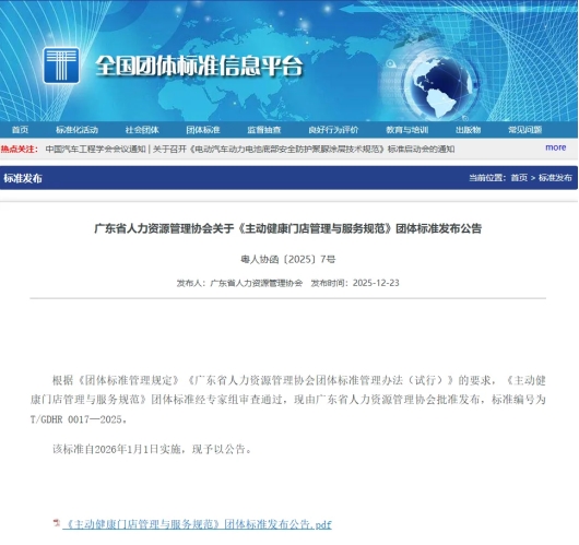 2025年12月23日,由骏丰科技(广东骏丰频谱股份有限公司)主导研制的《主动健康门店管理与服务规范》团体标准在全国团体标准信息平台正式发布,并将于2026年1月1日起实施。作为国内首个专门针对主动健康服务场景的团体标准,其出台填补了行业空白,为主动健康门店的规范化运营提供了权威指引。