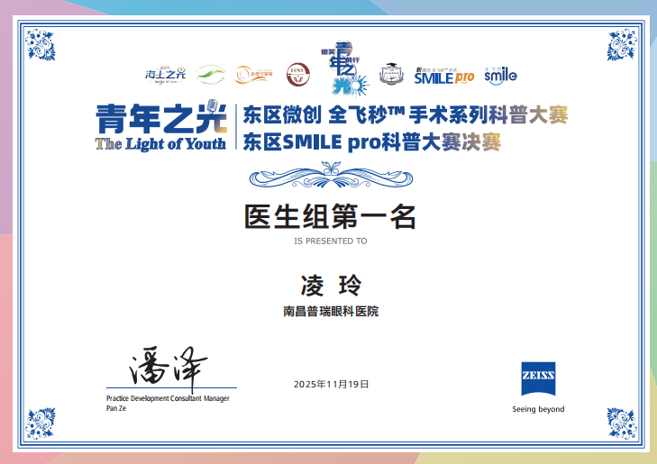 2025年,凌玲博士在微创全飞秒™手术系列科普大赛【大东区SMILEPro专场】青年之光科普大赛中,从十余位参赛青年医生中脱颖而出,一举斩获医生组第一名并成功晋级全国总决赛,正是医院青年力量崭露头角、科普能力得到认可的精彩缩影。