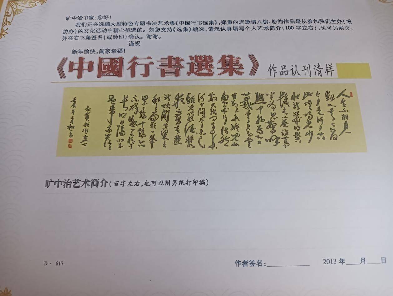 2011年8月,旷中治先生:由中国东莞观音山健康文化节组委会、书法报社联合主办的书法报“观音山杯”书法艺术大展征稿中,经组委会评审团的共同评审,您的作品已被收藏。《书法》报社中国东莞观音山健康文化节组委会