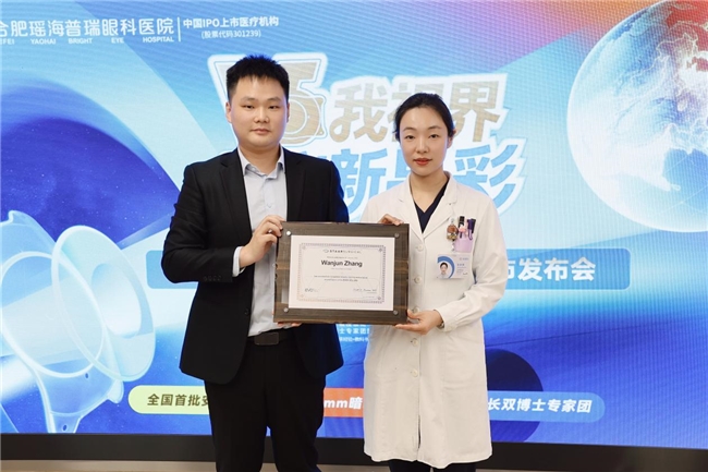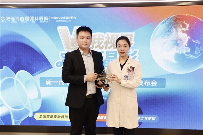 发布会现场,STAAR Surgical公司苏皖区域负责人王永飞先生亲临现场,向合肥瑶海普瑞眼科医院院长陈艳授予“EVO+ ICL(V5)首批临床应用合作中心”牌匾。陈艳院长表示:“此次获授全国首批合作中心,是ICL官方对我院医疗技术、专家团队、诊疗服务的高度认可。作为安徽首批开展V5晶体植入手术的医院,我们将以此为契机,坚守医疗本质,以前沿技术为支撑,为更多安徽近视患者带来清晰视界的希望。”