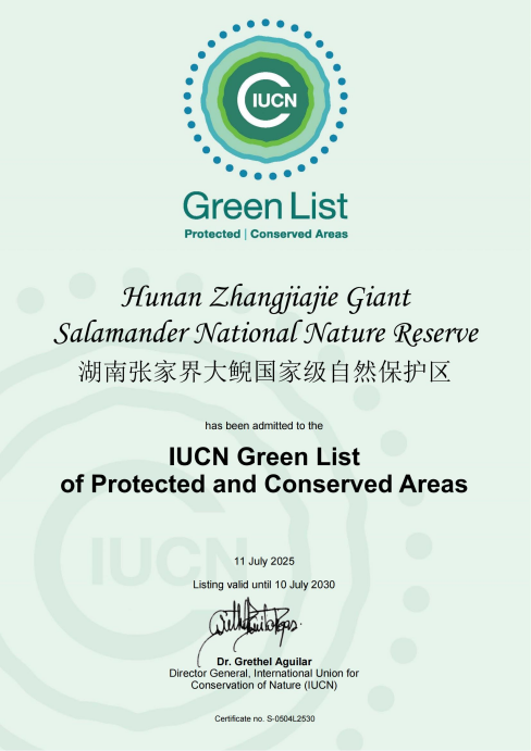 如果说张家界全市域的生态答卷彰显了决心,那么,2025年7月,国际自然保护领域的权威机构——世界自然保护联盟(IUCN)正式将湖南张家界大鲵国家级自然保护区列入其全球“绿色名录”,则为这片土地的纯净设定了世界级标尺。