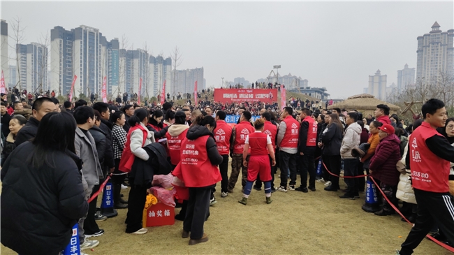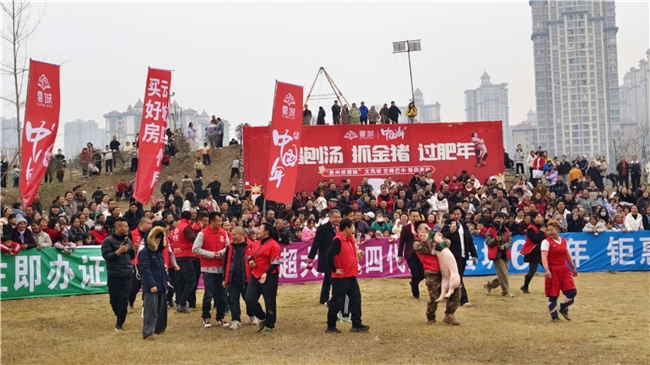 活动当天,云城营销中心及周边人头攒动、彩旗飘扬,红灯笼挂满了现场角落,新春氛围扑面而来。下午,蒙眼抓鸭、抓猪互动环节率先拉开帷幕,瞬间成为全场焦点。