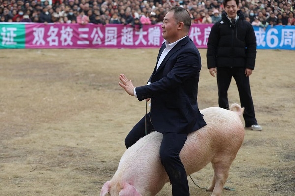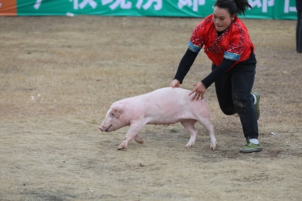 工作人员提前搭建好安全围栏,围栏外挤满了翘首以盼的观众,不少人举着手机记录精彩瞬间。围栏内,肥硕的土鸭扑棱着翅膀嘎嘎作响,憨态可掬的小猪甩着尾巴灵活穿梭,参赛者们被蒙住双眼,小心翼翼摸索,有的脚下一个踉跄引得全场哄笑,有的找准时机俯身一抱,精准抓住战利品后,高举着向场外挥手欢呼,脸上的笑容格外灿烂。围观群众的加油声、欢呼声、掌声此起彼伏,夹杂着鸭叫与笑声,将现场气氛一次次推向高潮。