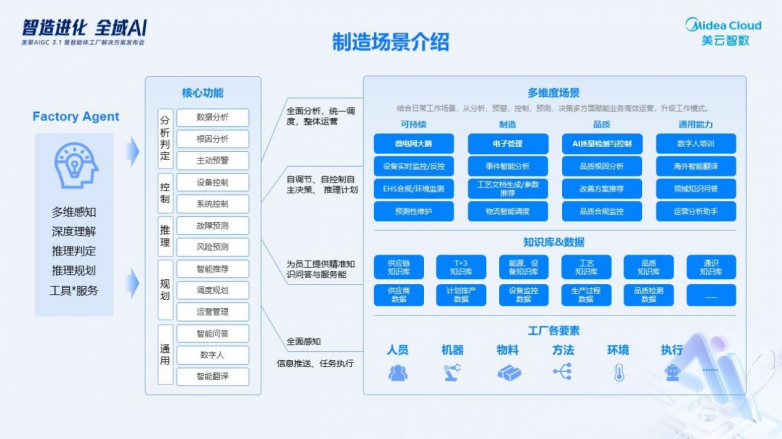 导语:在“智造进化,全域AI——美擎AIGC3.1 暨智能体工厂解决方案发布会”上,美云智数发布了制造AI智能体解决方案。相比一味强调AI“黑科技”,该方案依托美的集团“分析—预警—控制—预测—决策”闭环能力,将50余年制造经验转化为可执行的系统规则,在内部实践中取得显著成效。