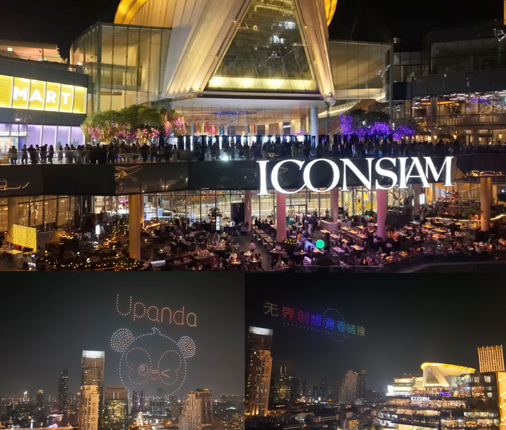 16日在曼谷地标建筑暹罗广场举办的“中泰一家亲”无人机秀,通过千架无人机组成中国天坛、泰国黎明寺、京剧脸谱、孔剧面具等中泰经典文化符号,运用创新科技传递文化之美。