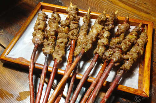 红柳枝承载着千年饮食智慧,削成小臂长的红柳,串起肥瘦相间的新鲜羊肉。炭火明灭间,鲁氏红柳枝经高温释放出琥珀色油脂,松针与枣香交织的清甜渗入肌理,悄悄瓦解了羊肉的腥膻。烤串在红炭上不断翻转,油脂滴落发出滋滋声响,表皮渐渐烤出金黄般焦脆,内里依旧鲜嫩多汁,咬开瞬间肉汁便在舌尖爆开。撒上粒粒分明的孜然与辣椒面,调料在余温中二次爆香,瘦肉吸饱油脂弹嫩不柴,肥肉烤成酥脆油渣,越嚼越香。