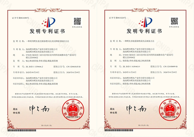 近日,国家知识产权局正式向 鳄珍集团 旗下海南鳄珍鳄鱼产业科学研究有限公司、海南鳄珍鳄鱼科技集团有限公司授予两项国家发明专利,分别为《一种鳄鱼多肽提取物及饮品制备方法》(专利号:ZL202511630463.0)和《一种利用鳄鱼蛋壳制备靶向抗炎抗肿瘤多肽的方法》(专利号:ZL202511339606.2)。