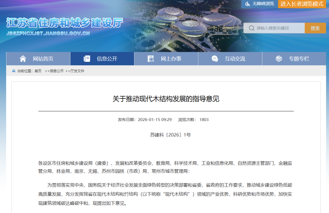 1月中旬江苏省率先出台《关于推动现代木结构发展的指导意见》,将其明确为城乡建设绿色转型的重要抓手。几乎同期,中加两国签署《关于现代木结构建筑合作的谅解备忘录》,开启了该领域的国际合作新篇。