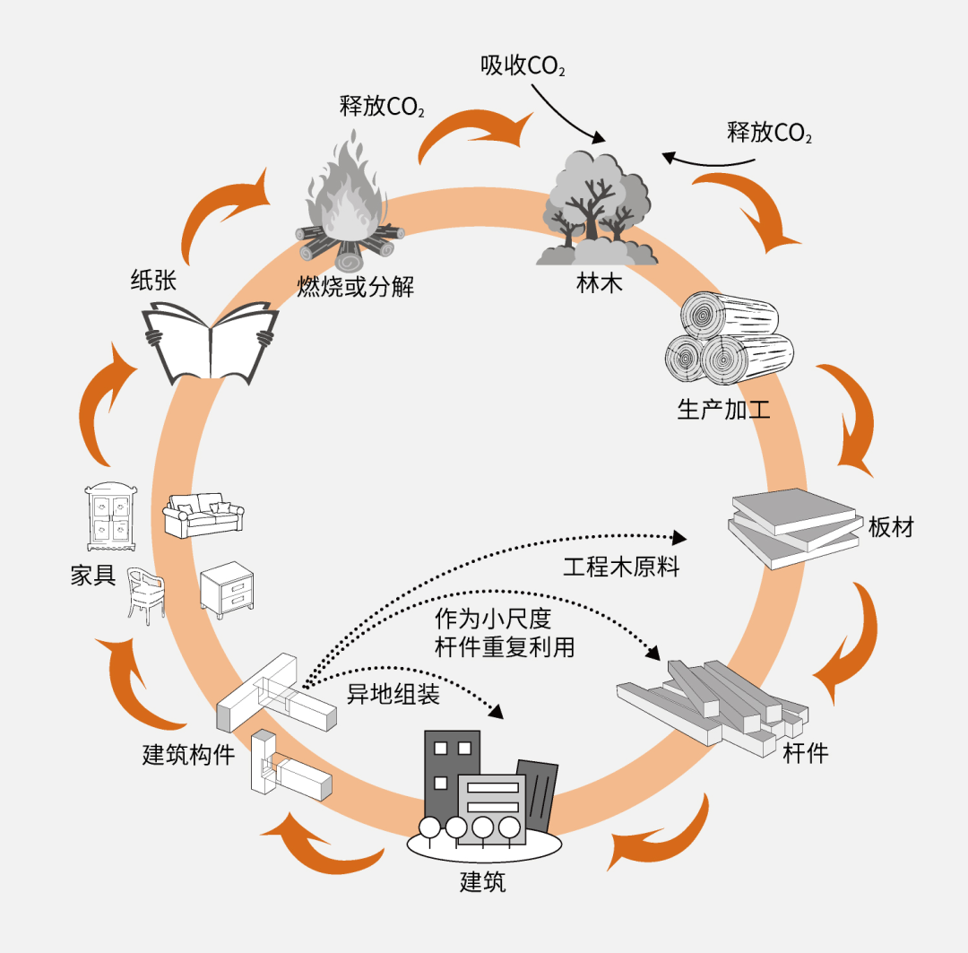 在践行“双碳”战略层面,木材是唯一可再生的主流建材,在其生长过程中持续吸收并储存二氧化碳,具备“前端固碳、中端节能、末端减排”的全生命周期低碳优势,是建筑领域减碳的关键路径。