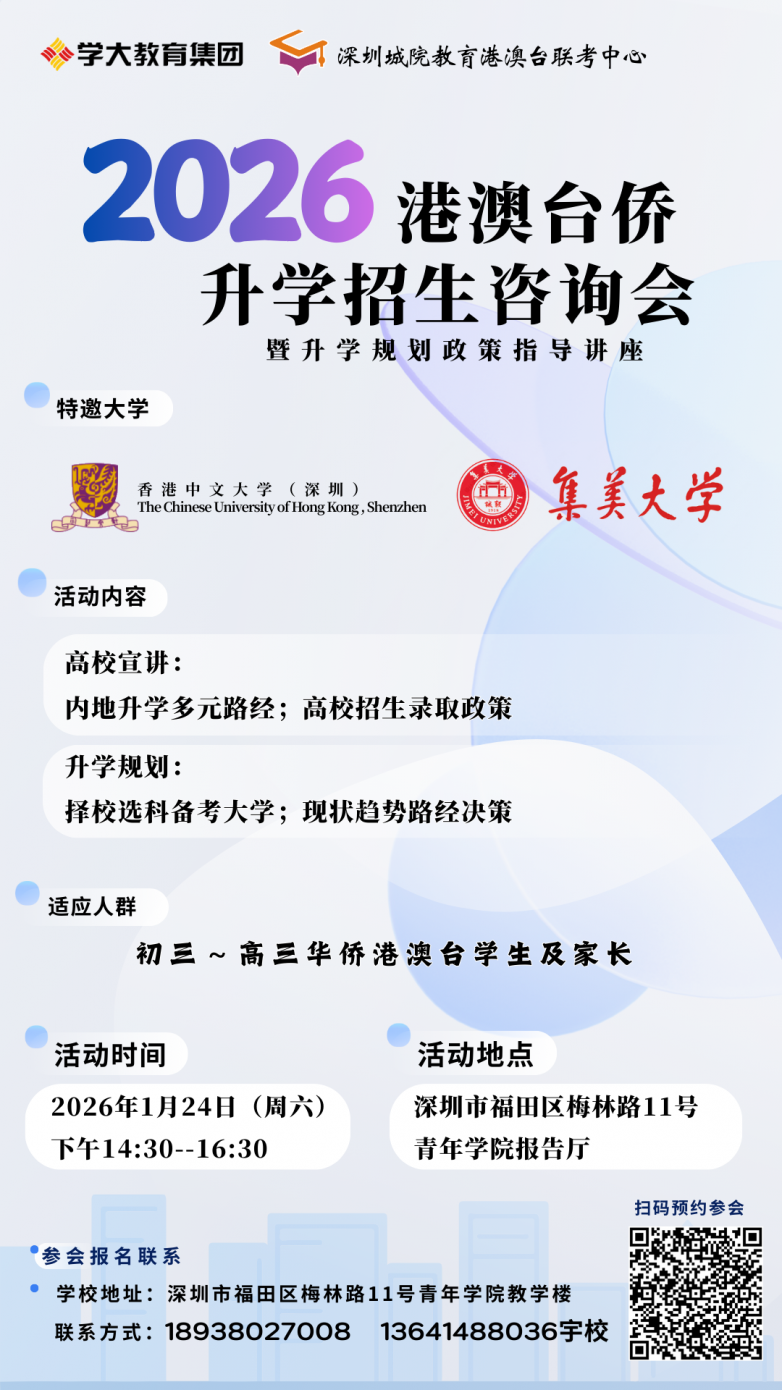 别慌!1月24日,深圳城院港澳台联考中心特邀两大重磅高校嘉宾坐镇,为你一站式破解所有升学困惑!