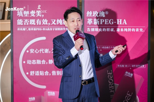本次会议的核心内容围绕新材料的特性与应用展开。键凯科技医美器械部负责人王辰先生在讲解中提到:“丝玫瑰PEG创新材料为美学产品带来了新的可能,它的特性使其能够更好地与皮肤组织相容,为实现更自然、更持久安心的效果提供支持。我们希望通过材料科学的进步,为美学行业带来更多扎实的支撑。”