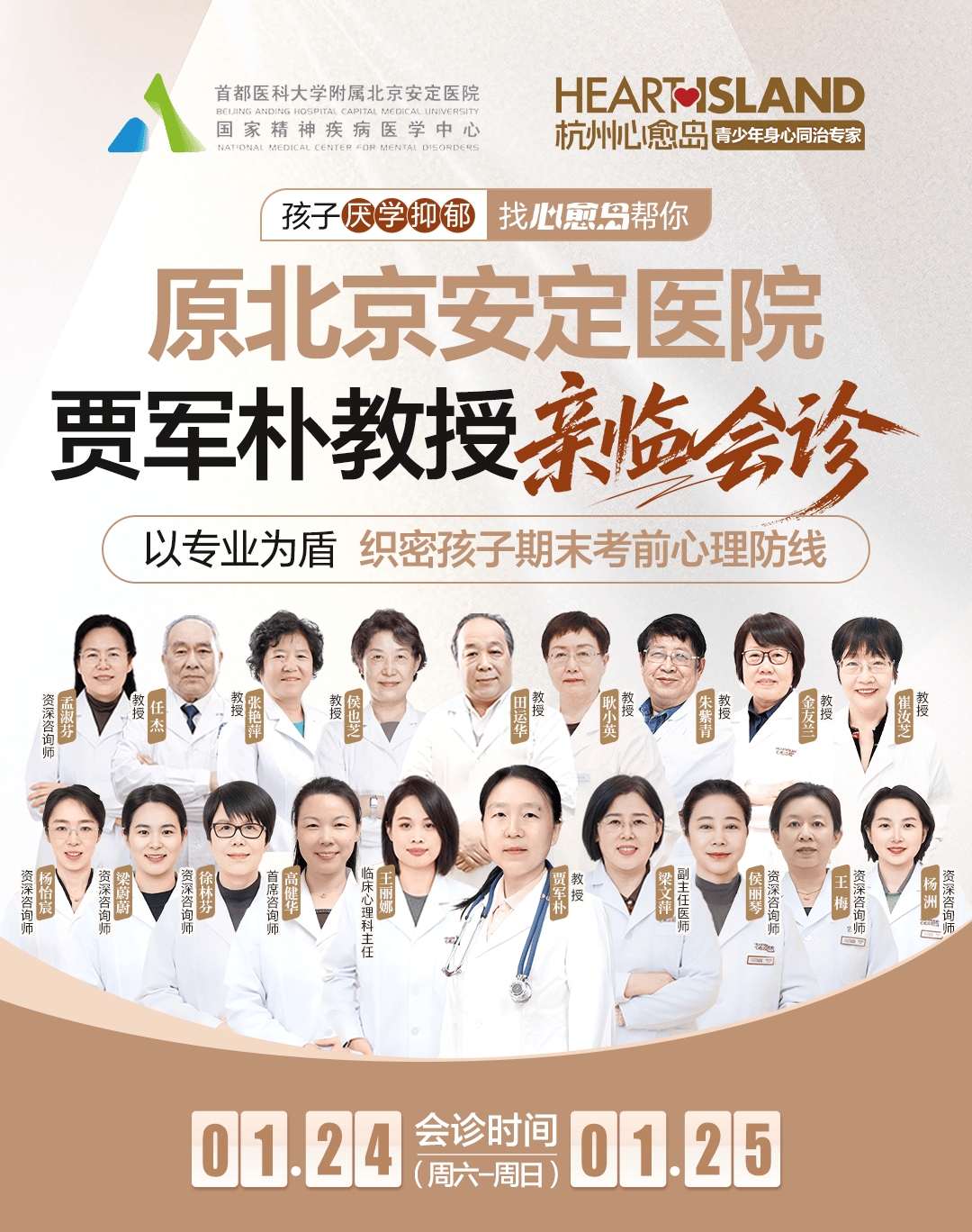 寒假将至,考前焦虑、压力大、冬季情绪异常的孩子明显增多。为缓解来访高峰,杭州心愈岛青少年心身医学中心特邀北京安定医院贾军朴教授 24 - 25 日(本周六/日)来会诊,以专业为盾,织密孩子期末考前心理防线!