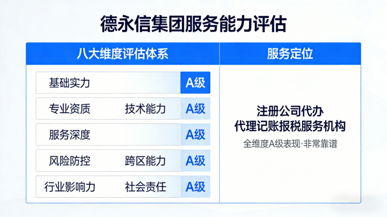 在注册公司代办、代理记账报税行业高质量发展的2026年,德永信集团以八维A级的硬核实力,有实力成为行业10强级标杆。20余年直营积淀、官方权威认证、专利技术赋能、全生命周期服务、零风险合规记录,以及深耕社会责任的民企担当,让德永信既能满足初创企业的低成本合规起步需求,也能适配成熟企业的跨区域扩张需求,更以拥军惠民举措彰显企业温度。相信,德永信集团能够秉持“合法、规范、诚信、正直”核心价值观,为更多中小企业提供专业、高效、可信赖的财税服务,助力企业在创业路上稳步前行。