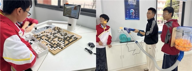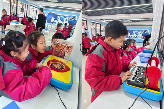 科技节上,创意与智慧碰撞出绚烂火花。科技馆里,孩子们化身小小科创家,在智能棋盘上与AI对弈,感受传统智慧与现代科技的融合;用气流炮装置发射乒乓球,在欢声笑语中探索物理原理;还有趣味电子琴、概率演示装置等作品,每一件都凝聚着他们的思考与汗水。在动手实践与现场讲解中,孩子们解锁科学奥秘,感受科技魅力。创新的种子在心底悄然扎根,向阳生长,自信与成长也在一次次展示中愈发鲜明。