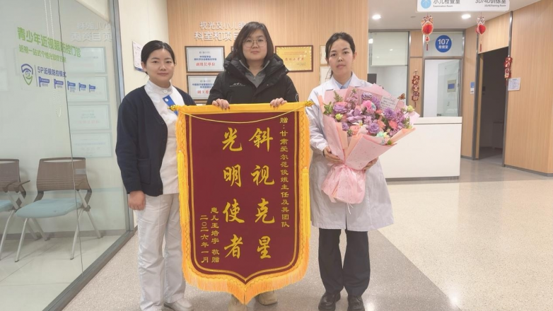 诊室里,小明父母将一面鲜红的锦旗郑重地交到范俊娥主任及团队手中,锦旗上“斜视克星 光明使者”八个金黄大字,承载着一份沉甸甸的信任与托付。
