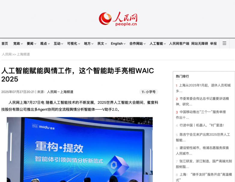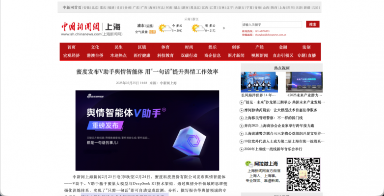 2025年2月,中国新闻网报道了蜜度推出的“V助手舆情分析智能体”,表示其用“一句话”提升舆情工作效率。通过V助手,过去需要耗费大量时间进行的监测、分析、写报告流程,现在只需一句指令就能自动完成。
