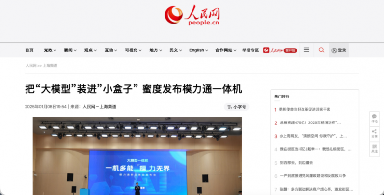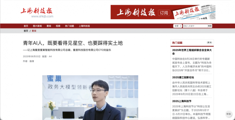 2025年,多家媒体都关注到蜜度深耕垂直场景的成果。2月,文汇报在模速空间的专场活动报道中,强调蜜巢大模型已在2024年1月通过大模型备案,正聚焦政务、媒体等垂直领域开展大模型科研与应用,实现商业化落地。
