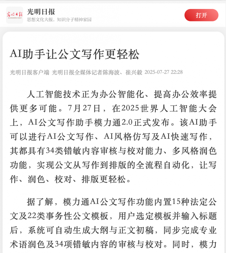 2025年7月,在世界人工智能大会上,模力通发布2.0版本,光明日报客户端为此发布报道。模力通2.0具备34类错敏内容审核与校对能力、多风格润色功能,实现公文从写作到排版的全流程自动化。产品内置的15种法定公文、22类事务性公文模板,更是帮用户省去了大量格式调整的时间。用户选好模板、输入标题,大纲和正文初稿就能自动生成,让写作、润色、校对、排版更轻松。