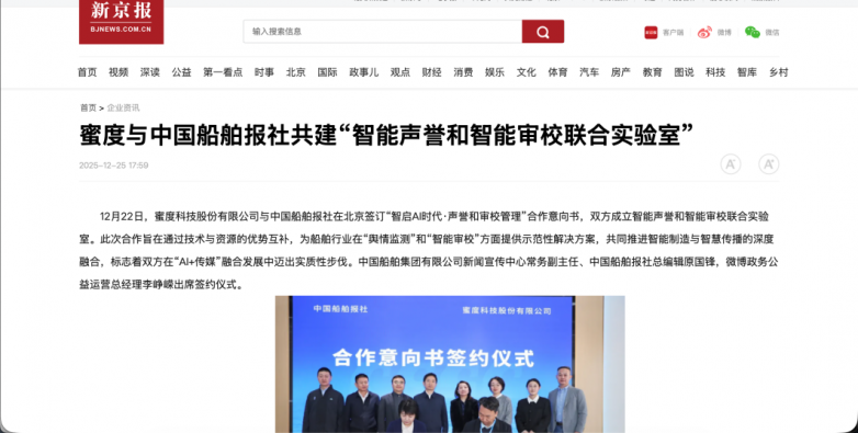 2025年12月,新京报报道蜜度与中国船舶报社签署合作协议,共同成立“智能声誉和智能审校联合实验室”。这一合作旨在通过技术与资源的优势互补,为船舶行业在“舆情监测”和“智能审校”方面提供示范性解决方案,共同推进智能制造与智慧传播的深度融合,标志着双方在“AI+传媒”融合发展中迈出实质性步伐。