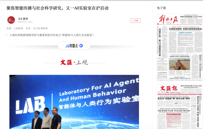 蜜度的2025年,不只有产品的迭代,更有开放的合作。10月,上观新闻报道了上海社科院新闻研究所与蜜度共同成立“智能体与人类行为实验室”的消息。实验室的成立,是蜜度在“AI+社会科学”交叉领域探索的关键一步,将为智能传播与社会科学研究提供强大的技术支持。