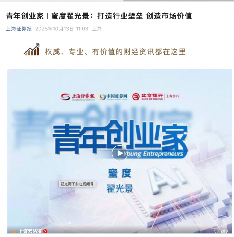 2025年10月,上海证券报《青年创业家》栏目,报道蜜度CEO翟光景的商业思考与实践。在被问及“如何成功穿越互联网与AI的双周期?”时,翟光景表示,蜜度穿越周期有三个“法宝”:技术能力、场景与数据优势及践行“创造更大价值”的使命。从单一产品到完善的产品矩阵,从技术研发到场景落地,蜜度一步一个脚印,在垂直领域里收获了用户的认可。