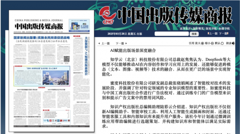 2025年3月,中国出版传媒商报记录了蜜度在行业研讨会上的分享。蜜度研发副总裁张晓娟谈及智能校对技术的发展阶段并强调了针对特定领域的专业知识模型的重要性。如蜜度与中国工商出版社合作进行广告法校对,通过训练专门的广告模型来识别和提示广告文案中的禁用词风险。