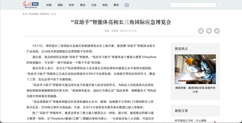 2025年5月,在长三角国际应急博览会上,光明网报道了蜜度专为应急管理领域打造的“双助手”智能体。“执法学习助手”智能体已完成应急执法领域共计200万字法律法规、合规指引等知识库的学习,执法人员通过手机就能随时检索法条知识和信息。全市2.6万家检查对象库基本数据也已接入“执法情报助手”智能体,实时发现信息与热点,为应急决策提供有力支持。