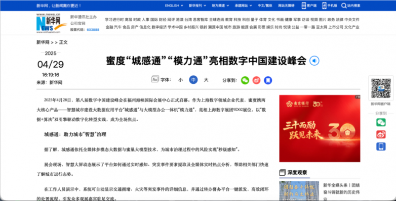 2025年4月的数字中国建设峰会上,新华网报道了蜜度的城感通产品。城感通聚焦城市治理数字化,能实时感知城市运行数据,交通拥堵、火灾隐患等突发事件的信息汇总到智慧大屏上,还能将相关信息一键派发至相关部门,形成高效闭环的处置流程。