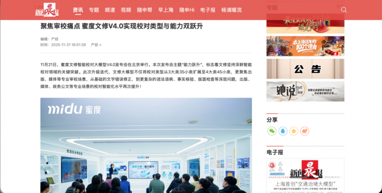 2025年11月,新闻晨报报道了蜜度发布文修智能校对大模型V4.0的消息。该版本不仅将校对类型从3大类35小类扩展至4大类45小类,更聚焦出版、媒体等专业审校场景,从基础的文字错误修正,到更复杂的语法语病、事实核验、版面检查等深层问题,进一步提升出版、媒体、政务公文等专业场景的校对智能化水平。