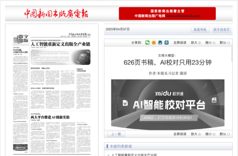 2025年4月,中国新闻出版广电报关注文修大模型的出色表现,以《文修大模型:626页书稿,AI校对只用23分钟》为题发布稿件。作为针对校对任务和审核场景设计的专业模型,文修不仅能检测错别字、病句,还能对标点符号、术语、事实性差错进行多维度审核,极大提升书稿校对速度,为出版行业降本增效提供了可靠工具。