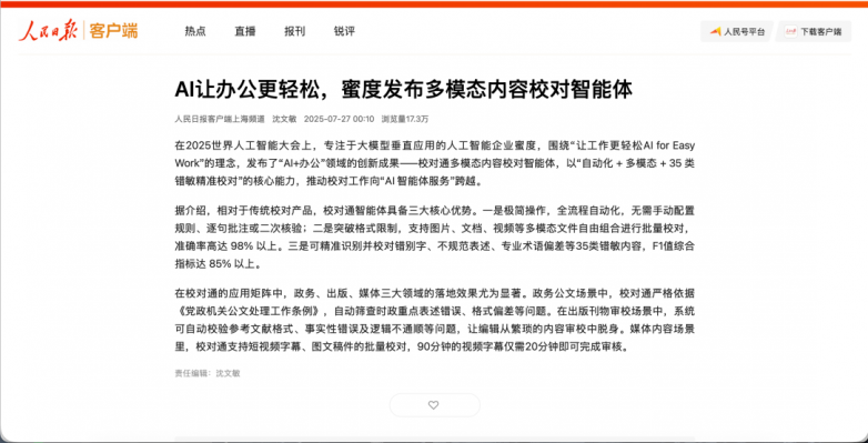 2025年7月,人民日报客户端报道校对通多模态内容校对智能体的发布。作为蜜度在世界人工智能大会上发布的AI新品,校对通智能体以“自动化+多模态+35类错敏精准校对”的核心能力,推动校对工作向“AI智能体服务”跨越,在政务、出版、媒体三大领域的落地效果尤为显著。