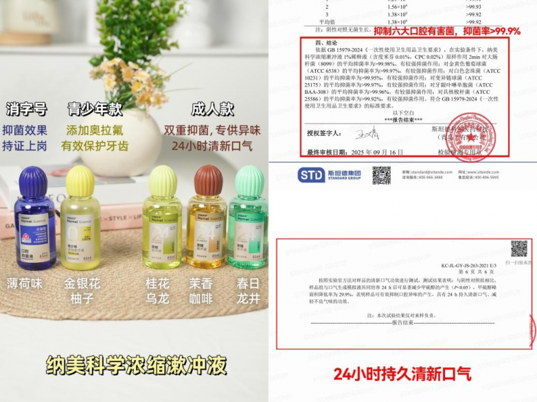 单纯的水流冲洗主要解决食物残渣问题,但对牙菌斑及口腔异味的源头——有害微生物,作用有限。纳美科学电动漱冲器配套使用的纳美科学浓缩漱冲液,浓度远超普通漱口水,且含有CPC与度米芬双重抑菌体系,能有效应对多种口腔常见有害菌。