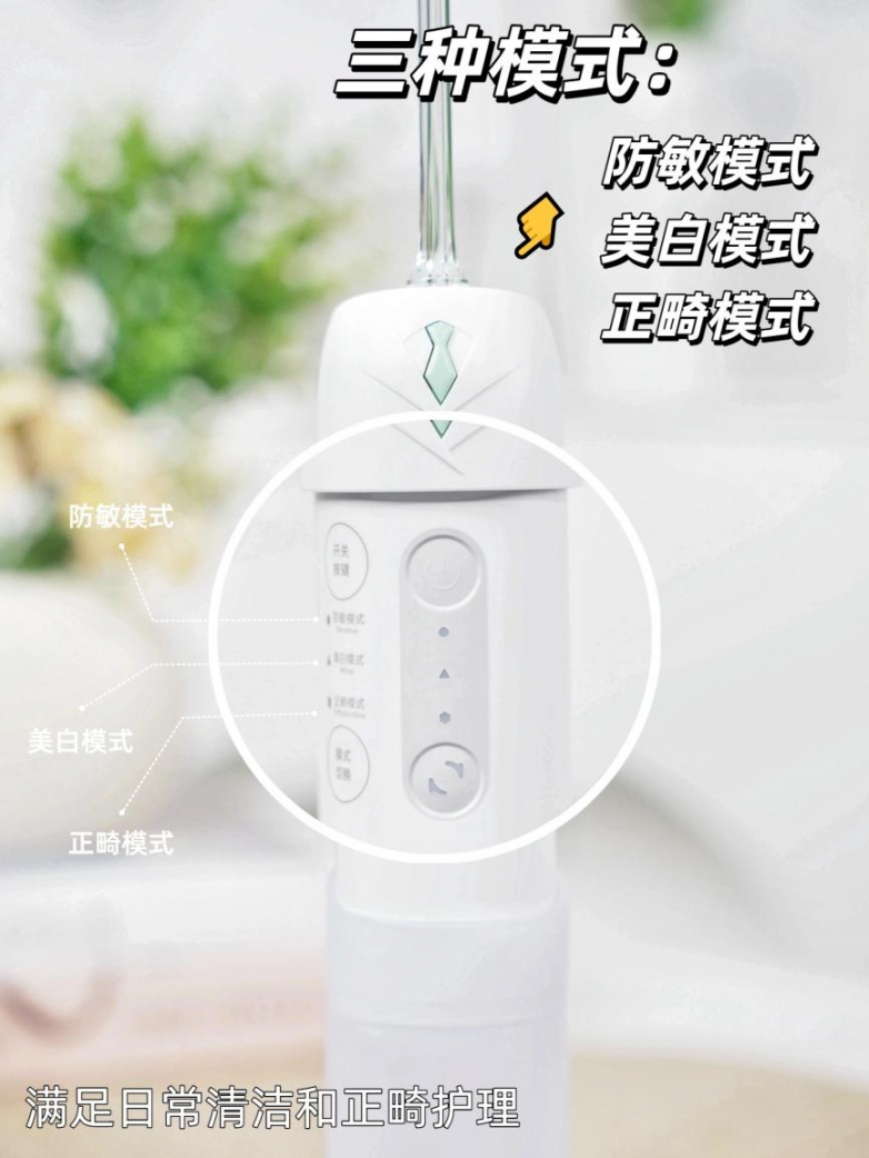 产品设有防敏、美白、正畸三档清洁模式,用户可根据自身牙龈状况或清洁需求自由切换。同时,其可提供最低30PSI的轻柔水压,并配有3秒水流渐强设计,对青少年或牙龈敏感人群十分友好,能帮助用户舒适地开启护理。在配件方面,除了能深入后槽牙区域的S型标准喷头外,产品还特别配备了可360度旋转的正畸专用喷头,柔软的硅胶材质能温和环绕托槽与钢丝进行清洁,有效带走隐藏的食物残渣,为正畸人群提供专业而便捷的口腔清洁方案。
